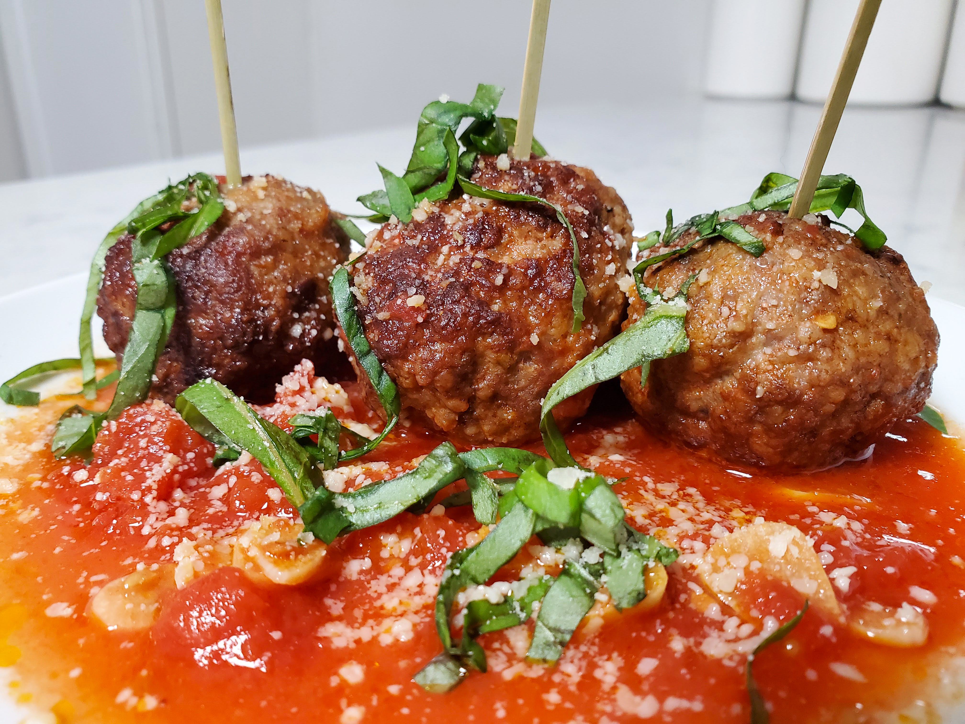 Plate them up on a tray by layering a good dollop of the marinara sauce down, then the meatballs, then fresh grated parm and fresh cut basil.